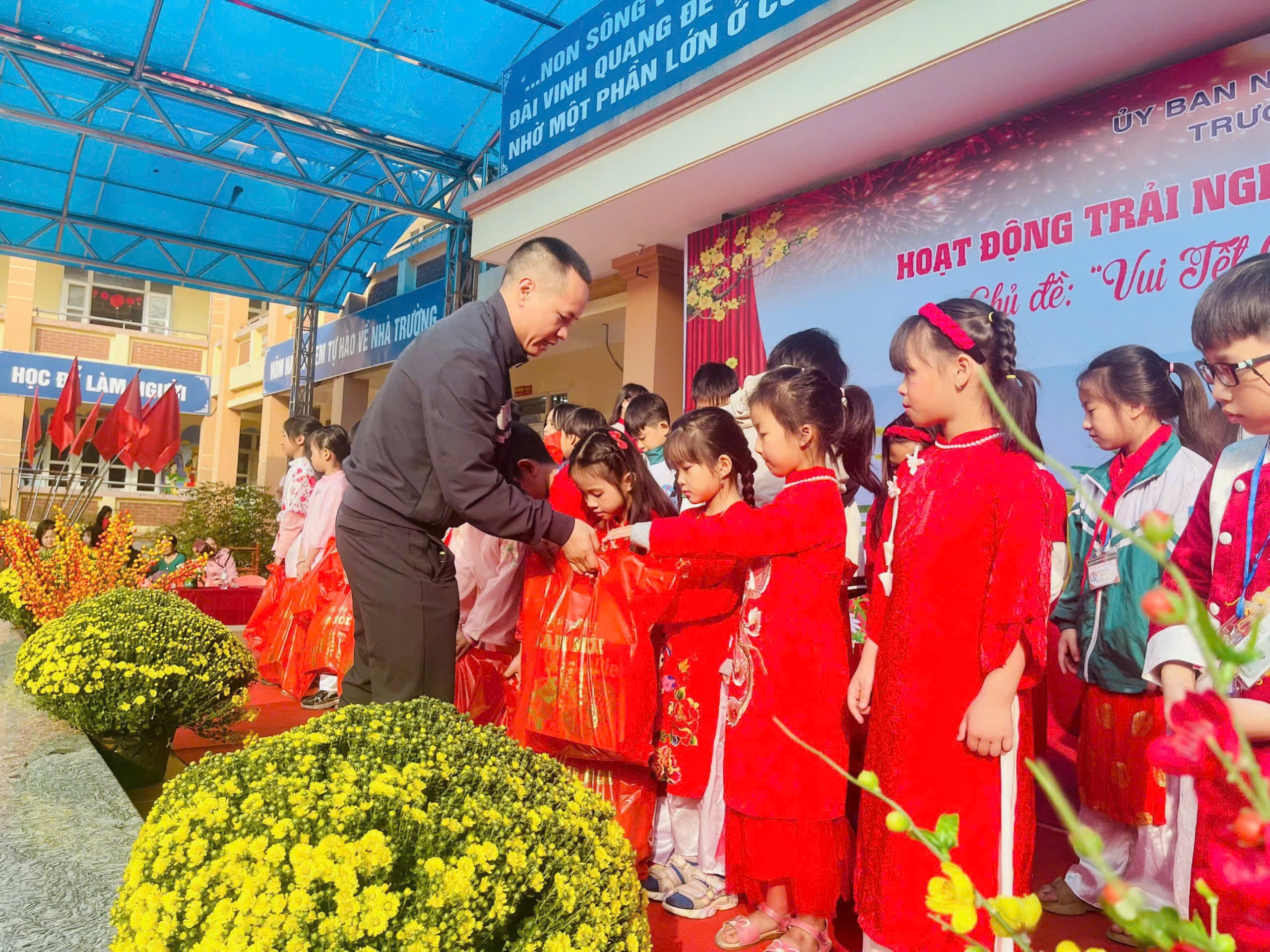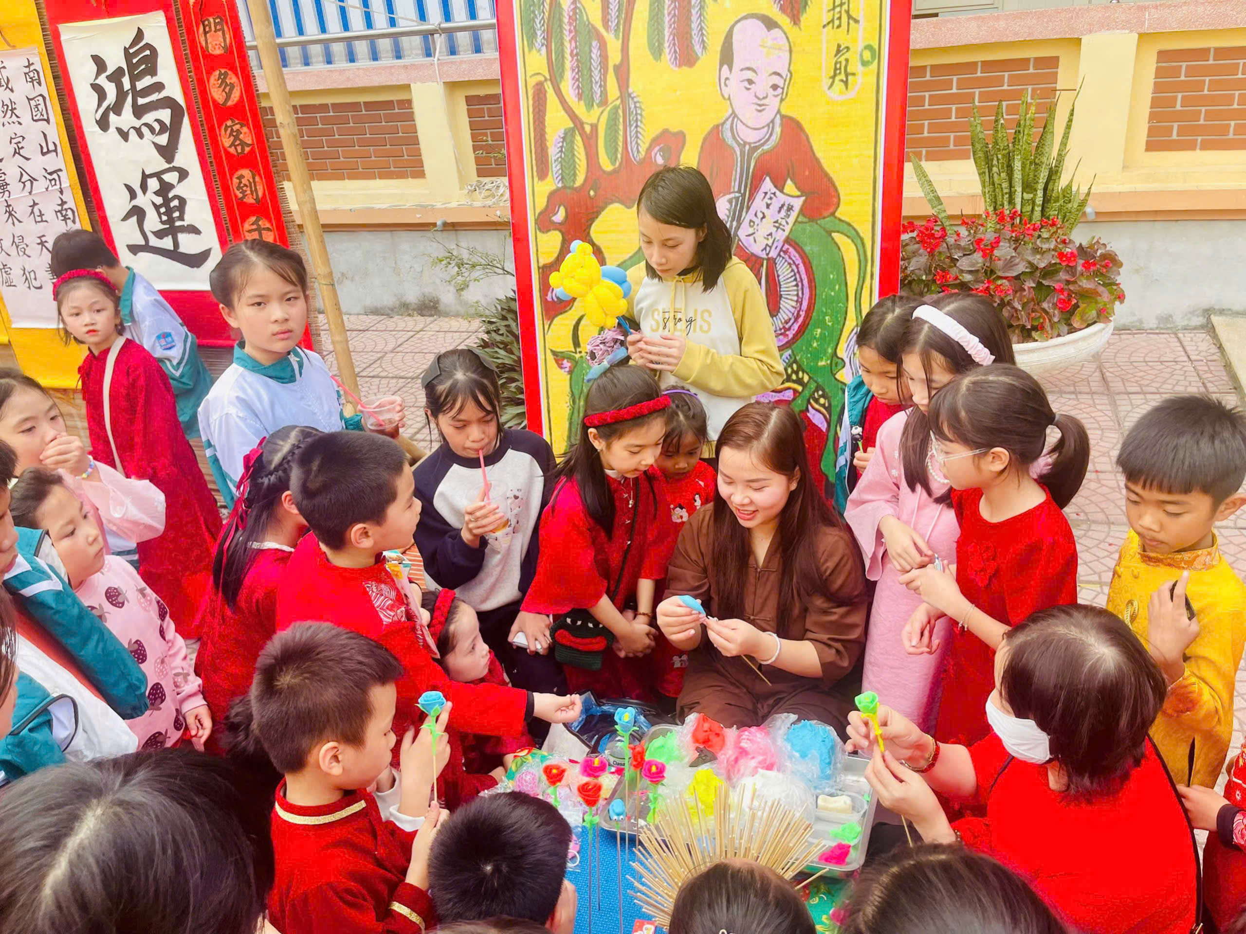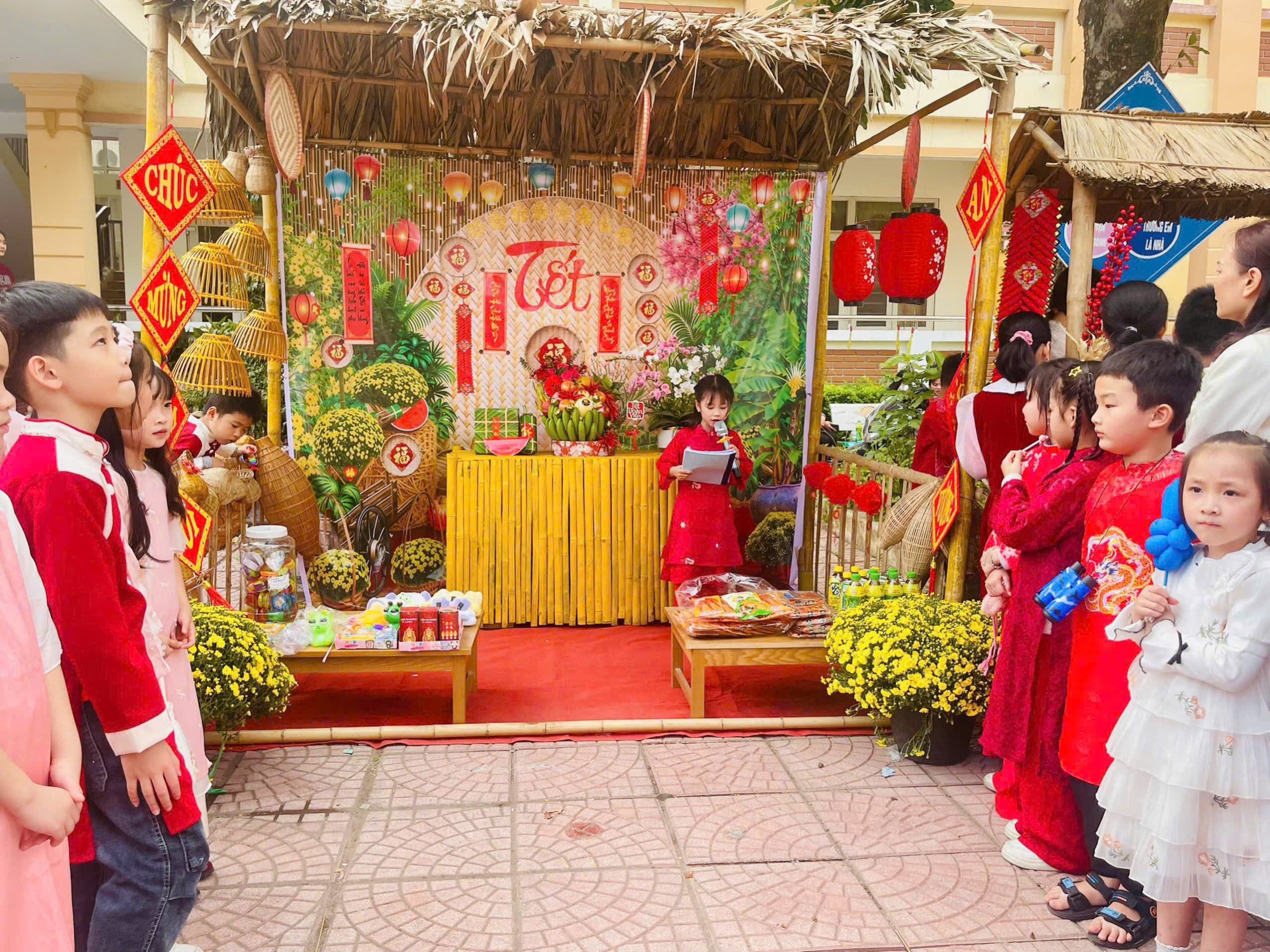 🎋 Hội chợ diễn ra sôi nổi với những hoạt động: văn nghệ, múa lân, múa rồng, võ Vovinam, gian hàng trưng bày sản vật ngày Tết, viết thư pháp, nặn tò he, gói bánh trưng, trò chơi dân gian… Các em học sinh được trực tiếp tham gia trải nghiệm, rèn luyện kỹ năng giao tiếp, hợp tác, sáng tạo và hiểu thêm về ý nghĩa của Tết cổ truyền Việt Nam.